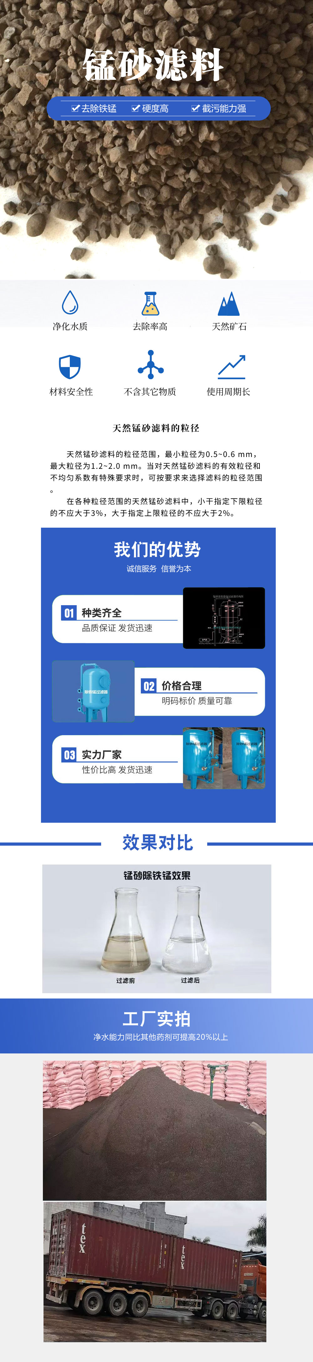 錳砂濾料以錳礦石為原料,經(jīng)破碎、篩分等加工而成。外觀粗糙呈褐色或淡灰色,常用于生活飲用水的除鐵、除錳過濾裝置,濾水效果非常良好。(注:MnO2≥35%既可除鐵,又能除錳,MnO2≤30%)只能用于地下水除鐵)錳砂濾料是一種地下水處理濾料,外觀黑褐色,近圓形,主要成份是二氧化錳,含量在35%-45%之間。